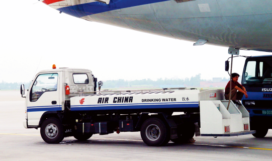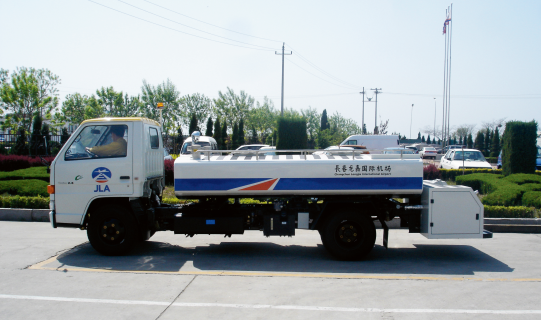 该类设备是通过车载装置,为飞机提供清洁生活用水的自行式机场地面保障设备。该设备由汽车底盘、水箱总成、尾部框架总成、供水系统、液压系统和电气控制系统组成。